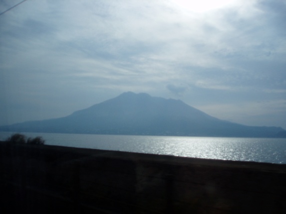 指宿枕崎線で踏切事故があったらしく、列車は定時の2分遅れで鹿児島中央駅を出た。列車は485系の5連。車内は昔のままだが、車体は赤く塗られている。鹿児島中央から5分ほどで鹿児島駅に着き、鹿児島駅を出ると鹿児島湾沿いを走り、桜島が見えてくる。私が座っていたのは桜島が見える進行方向右側とは逆の左側なのだが、自分の席から見ると、右側のいくつもの窓にまたがって雄大な桜島が見える。列車の乗車率はけっこう良く、ほぼ全ての2人がけの席に1人ないしは2人座っていた。指定を取らない人が多いのかな…。JR九州では喫煙車を1編成あたり1両にして、その1両に自由席と指定席の両方を設けている。