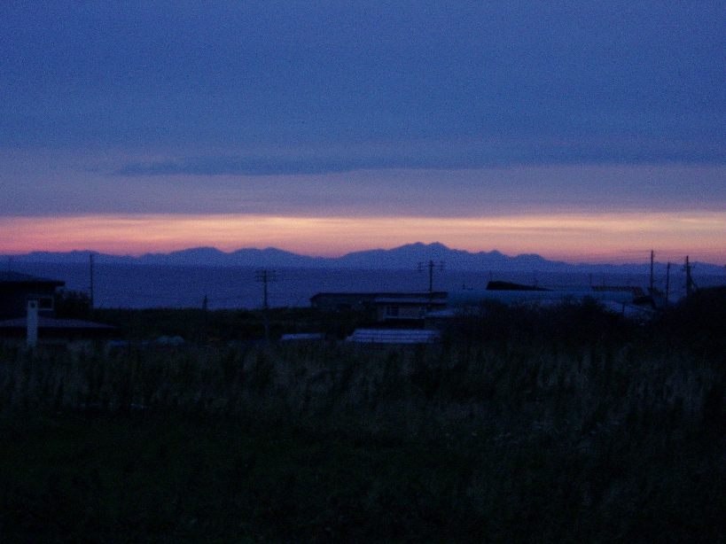 5時で閉館になるのでバス停の場所を聞いたらここから離れているということなので歩いて行った。バス停に着いてバスの時刻を見ると30分以上時間があったので、15分ほど歩いて根室駅に近いバス停まで歩いた。根室湾に沈む夕日を見ながら誰も歩いていない国道44号を歩いていると、日本の果てまで来たんだなあという気になった。バス停からバスに乗り、根室駅に戻った。観光案内所では今度は旅館を紹介してもらった。駅の近くでコインランドリーのあるところということで紹介してもらった旅館は部屋こそは昨日と同じ広さだったが、なんとテレビが有料…。2時間100円のやつ。今時こんなのがあるのかとある意味驚いた。